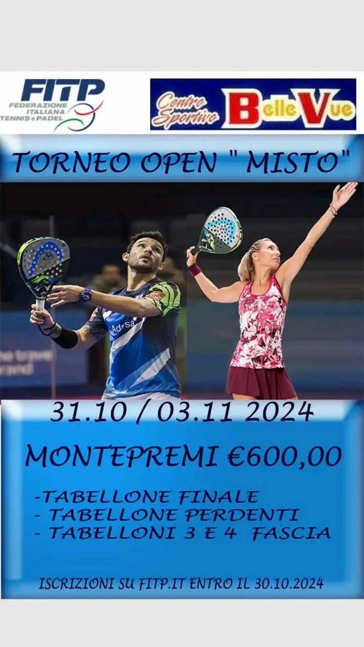E’ tutto pronto per un altro grande evento di padel presso il Centro Sportivo “Belle Vue”. Dal 31 ottobre al 3 novembre si disputerà un nuovo torneo Open Misto con un ricco montepremi di 600 euro. Le iscrizioni su FITP.it sono aperte fino al 30 ottobre.