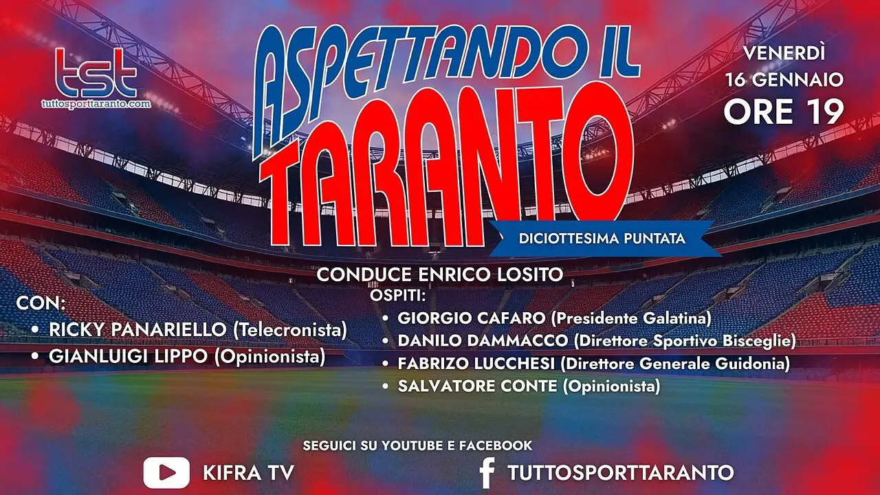 Venerdì 16 gennaio dalle ore 19:00 in diretta dagli studi di Ki.fra Tv andrà in onda “ASPETTANDO IL TARANTO”, il contenitore sportivo a cura della redazione di Tutto Sport Taranto.com condotto da Enrico Losito, coadiuvato dal telecronista Ricky Panariello e dall’opinionista Gianluigi Lippo con la regia di Claudio Ingrosso. Nel corso della puntata tratteremo le tematiche di stretta attualità della SS Taranto Calcio soffermandoci sulle prossime gare con il Galatina in campionato e il Bisceglie in Coppa Italia. Ospite in studio: Salvatore Conte, in qualità di opinionista mentre in collegamento ci saranno Fabrizio Lucchesi, direttore generale del Guidonia ed ex diggì rossoblu, Giorgio Cafaro, presidente del Galatina; Danilo Dammacco, direttore sportivo del Bisceglie. Vi aspettiamo in diretta sulle pagine ufficiali Facebook, Youtube e Twitch di Tutto Sport Taranto e Ki.fra tv dalle ore 19:00 con le vostre domande, commenti e opinioni…NON MANCATE!!! Il contenitore sportivo è stato realizzato grazie al supporto di Studio Fornaro-Occhinegro dottori commercialisti associati, in Piazzale Dante, 8 a Taranto; in via Skanderbeg, 64 a Bari e in via Einaudi, 10 a Locorotondo (BA); Erario Ottavio Srls – Costruzioni edilizie in via Don Minzoni, 2 a Manduria (TA); 101 Desideri Floreali, Via Lama, 120 a Lama (TA) cell. 389/5245740; Hotel Virgilio "Una Terrazza sul Mare " Viale Virgilio, 4 a Taranto tel. 099/4594116; Nolocar Srls , via Galeso, 355 a Taranto cell. 346/5075088; Headway Travel di Ascoli Annunziata, Piazza Vittorio Veneto, 3 a Palagiano (TA) tel. 099/6528083; Auto Zentrum Rent Car by Giuliani, sede di Mottola, via C.A.Dalla Chiesa, s.n.c.,tel.099/8051329; cell.388/4456544; 328/6130332; sede di Gioia del Colle via Giulio Pastore, 78; tel. 080/4729201; cell. 328/6130332.