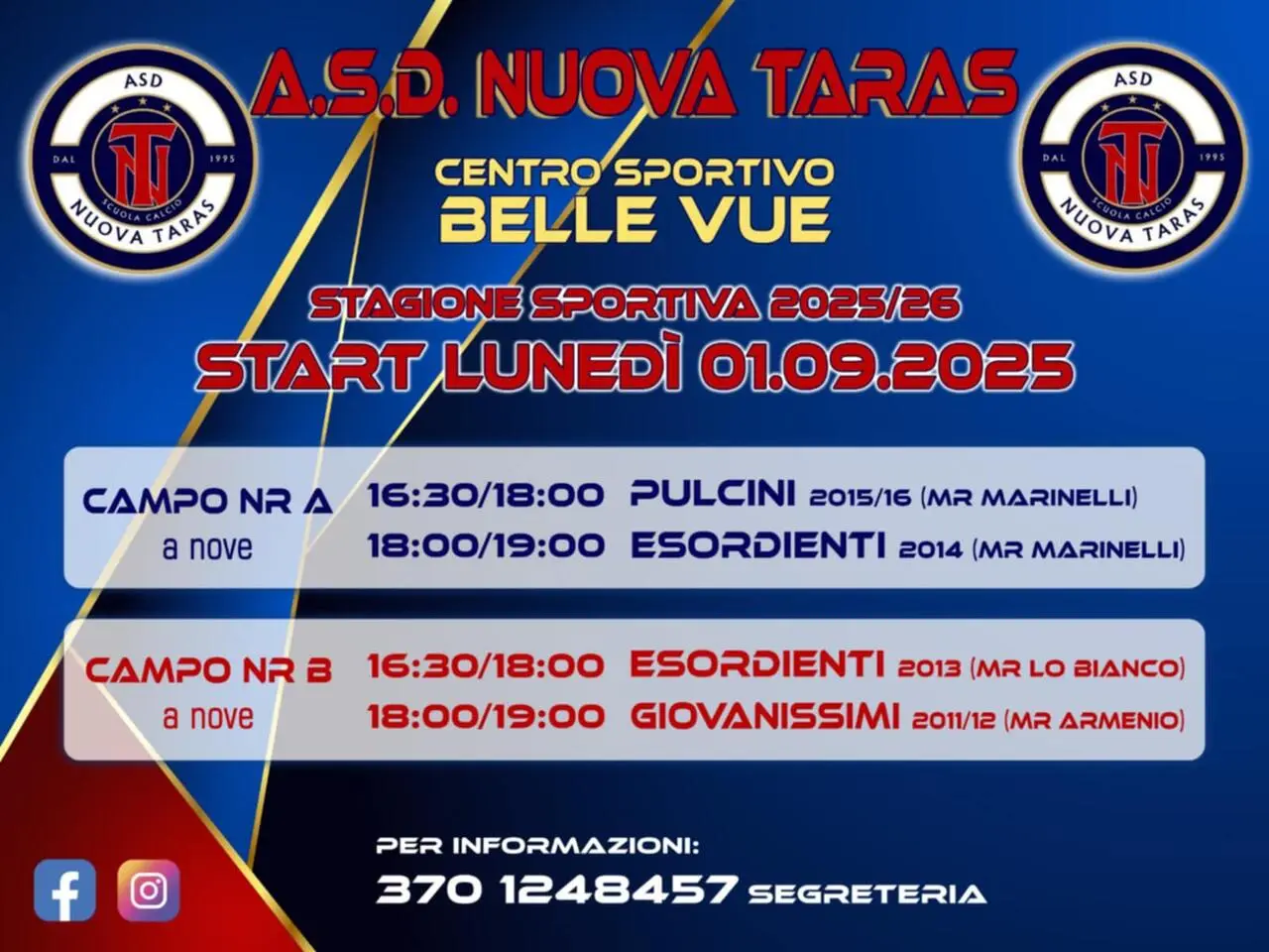 Inizia con un grande pomeriggio presso il Centro Sportivo “Belle Vue” la stagione 2025-26 della Nuova Taras. Di fatto lunedì 1 settembre presso la rinomata struttura di Tramontone ci saranno i primi allenamenti per Pulcini 2015-16 dalle 16:30 alle 18:00 e per Esordienti 2014 dalle 18:00 alle 19:00 entrambi tenuti dal tecnico Massimo Marinelli e Luigi Galeandro. Nel frattempo, agli stessi orari si alleneranno anche gli Esordienti 2013 seguiti dal tecnico Andrea Lo Bianco e i Giovanissimi 2011-12 allenati da Pasquale Armenio. Il tutto sotto la supervisione del Direttore Tecnico Fabrizio Brignolo, del Preparatore Atletico Ciro Gallo e del Preparatore dei Portieri Nicola Signorile. Per maggiori informazioni chiamare la Segreteria al 3701248457.
