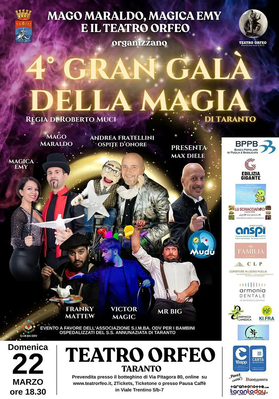 Taranto si prepara a lasciarsi incantare ancora una volta. Domenica 22 marzo, alle ore 18.30, il Teatro Orfeo ospiterà la quarta edizione del Gran Galà della Magia di Taranto, un appuntamento che, nel giro di pochi anni, è diventato uno degli eventi più attesi del panorama artistico cittadino.