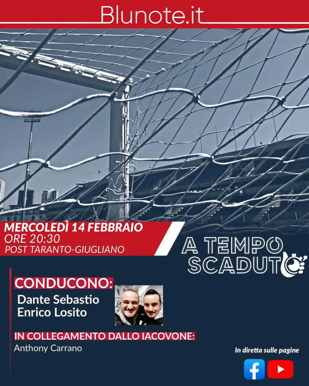 Mercoledì 14 febbraio dalle ore 20:30, appuntamento con “A TEMPO SCADUTO”, il contenitore sportivo a cura della redazione di Blunote.it condotto da Dante Sebastio ed Enrico Losito. Commenteremo la gara Taranto-Giugliano con il nostro Anthony Carrano che raccoglierà le dichiarazioni dei protagonisti dalla sala stampa dello stadio “Erasmo Iacovone. Vi aspettiamo in diretta sulle pagine ufficiali Facebook e Youtube di Blunote Web dalle ore 20:30! Il contenitore sportivo è stato realizzato grazie al supporto di Hotel Virgilio in Viale Virgilio, 4 a Taranto; Ipersport in via per S. Giorgio Jonico km 10 (contrada Cimino) a Taranto; Elettrica Martino in Via De Cesare, 8/10 a Taranto; Studio Radiologico San Tommaso in via Luigi Settembrini, 232 a Talsano (TA); Teatro Cinema Orfeo in via Pitagora, 98 a Taranto; Studio Fornaro-Occhinegro dottori commercialisti associati, in Piazzale Dante, 8 a Taranto; in via Skanderbeg, 64 a Bari e in via Einaudi, 10 a Locorotondo (BA); Studio Dentistico Sannelli Dr. Vito e Fabio Sannelli in viale Magna Grecia, 20 a Taranto, Ottica Dierre in Corso Italia, 329/331 a Taranto; Farmacia Galantino di Mauro e Carla in via Medaglie D’Oro, 19 a Taranto; CAFFE FADI, Coffee World by Coffee Break in via Dante Alighieri, 283 a Taranto e Onoranze Funebri “GLI ANGELI s.r.l.” H24 Attolino in via Monfalcone, 17 e in via C. Battisti, 90 a Taranto e in via V. Emanuele, 31/A a Leporano.