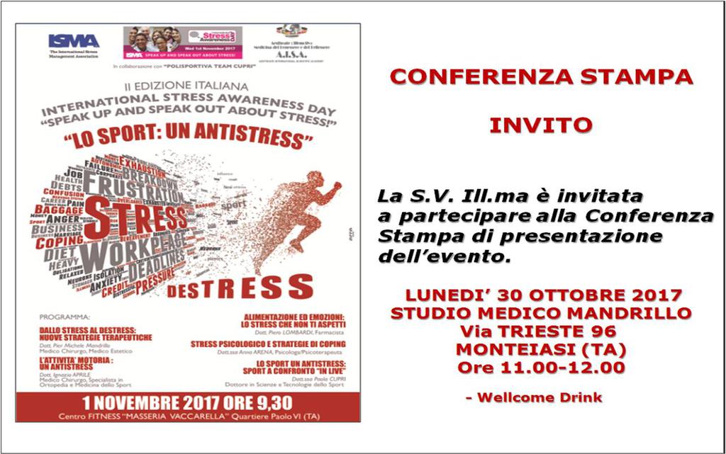 Per la seconda volta in Italia ed in contemporanea in 20 Paesi del Mondo, il Dott. Pier Michele Mandrillo, Medico Tarantino, Docente nelle Università di Foggia e Tor Vergata Roma, in qualità di Presidente Internazionale di AISA (Aestheate International Scientific Academy) associato ad ISMA (International Stress Management Association), prestigiosa associazione scientifica internazionale di promozione della prevenzione dello stress e del benessere, ha pensato di organizzare l’evento nella nostra città per portare essa stessa agli onori scientifici e mediatici internazionali per una iniziativa scientifica salutistica di vita, piuttosto che solo, ahimè, per l’odore di morte.