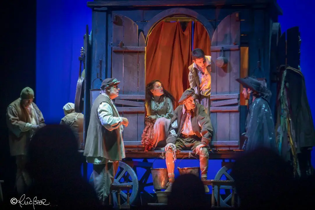E col “teatro” si riesce anche a mangiare, quasi sempre. Infatti, grazie agli stratagemmi di tutti i componenti della teatrale si rimedia il pasto quotidiano o qualche misera offerta in monete o, più spesso, qualche pezzo di animale, già cucinato, offerto come compenso della esibizione sul palco-carretto, manco a dirlo, delle opere di Molière (L’Avaro e il Malato Immaginario sono “i cavalli di battaglia” di cui vengono proposti i momenti salienti, opportunamente adattati al luogo e agli astanti). Gli incontri