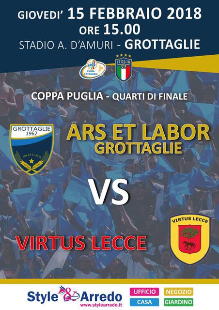 Domani pomeriggio alle 15:00 l’Ars et Labor Grottaglie sarà nuovamente in campo al D’Amuri per affrontare la Virtus Lecce nella gara di andata dei quarti di finale dei Coppa Puglia. La competizione in questa fase entra nel vivo, le gare iniziano ad essere maggiormente equilibrate e tutte le compagini che vi giungono non sono mai delle sprovvedute. Al Grottaglie è toccata la Virtus Lecce, squadra di Prima categoria con una graduatoria, quella del girone C, non del tutto tranquille. I leccesi sono terzultimi in classifica con 17 punti e nell’ultima partita di campionato hanno pareggiato 1 a 1, in casa, contro il fanalino di coda Cutrofiano. I numeri statistici della Virtus relativi al campionato non sono eccezionali: hanno giocato 17 partite, ne hanno vinte 4, pareggiate 5 e perse 8 (media di un punto a partita), sono andati a segno 28 volte e hanno subito 29 reti, un attacco non propriamente da sottovalutare ma con una difesa perforabile. In trasferta ha vinto due partite ha subito 12 reti e ne ha segnate 10. Il percorso in Coppa della Virtus è stato il seguente: ha vinto il triangolare eliminatorio sbarazzandosi del Monteroni (3-0 in casa) e dello Spartak Lecce (4-1 in trasferta); nei sedicesimi di finale ha eliminato il Trio Calcio Trepuzzi perdendo 1 a 0 a Trepuzzi e vincendo 3 a 0 a tavolino nella gara di ritorno per il ritiro degli avversari; negli ottavi ha eliminato il blasonato Leverano perdendo 1 a 0 fuori casa e vincendo 3 a 1 a Cavallino. Dall’analisi dei numeri statistici il Grottaglie sembrerebbe favorito ma in competizioni come queste, ad eliminazioni dirette, dove le gare si giocano nell’arco dei 180 minuti e con il regolamento Uefa vigente, basta sbagliare una volta per non avere una seconda opportunità. I biancoazzurri devono affrontare gli avversari di turno con la massima concentrazione senza lasciare niente al caso, chi arriva ai quarti ha della qualità e carattere. Il Grottaglie ha anche la necessità di mettersi al sicuro con il risultato, in visione della gara di ritorno che si disputerà giorno 1 marzo ovvero alla vigilia dell’importantissimo match contro il Conversano (04.03.18).