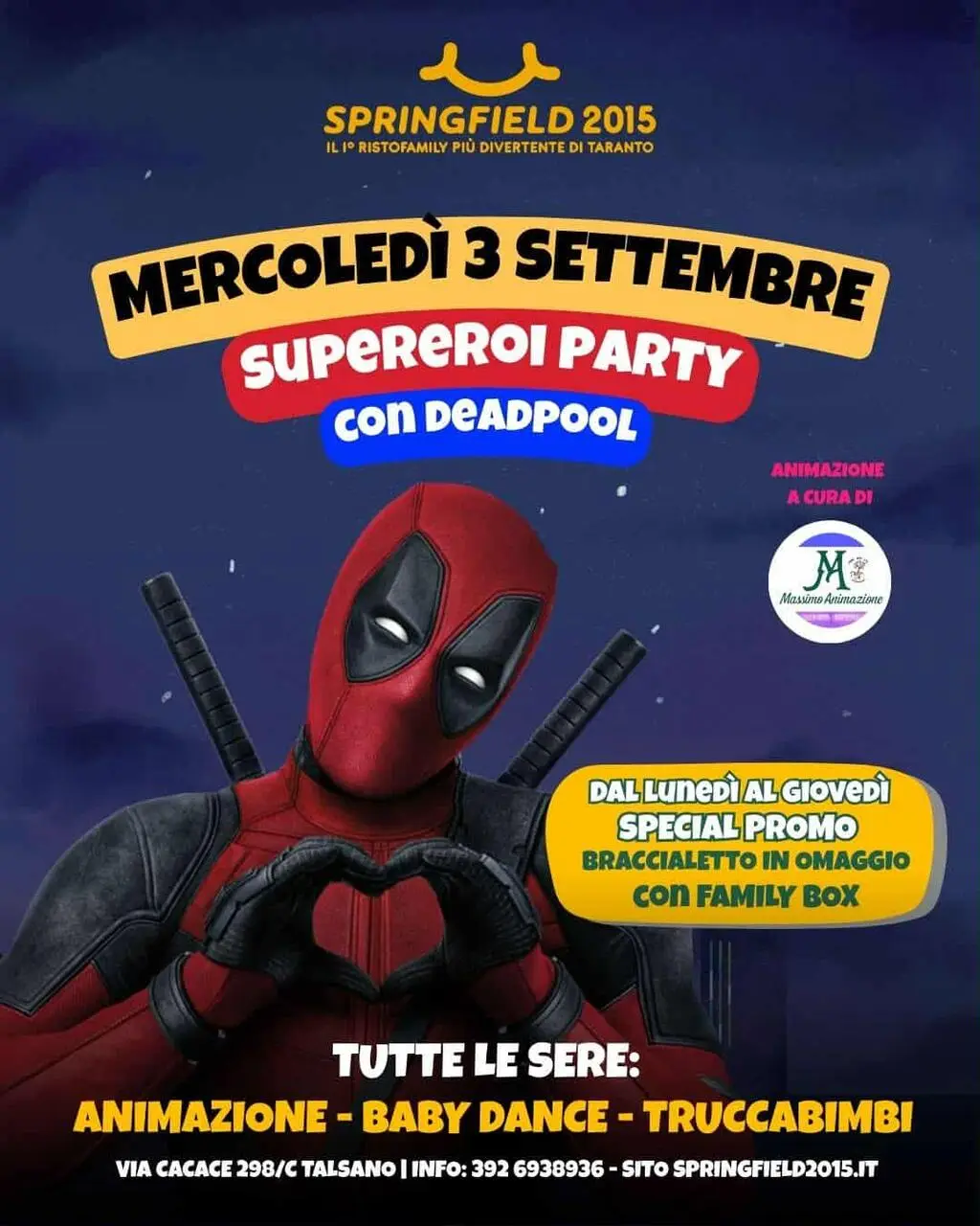 Ancora un grande appuntamento al locale “Springfield 2015” di Talsano. Di fatto mercoledì continua la rassegna con i personaggi dell'Associazione Gio' Gio' e i Supereroi. Questa volta il graditissimo ospite sarà Deadpool che avrà la missione di regalare sorrisi e scattare foto con tutti i presenti in sala. Non mancate: ci sarà da divertirsi!