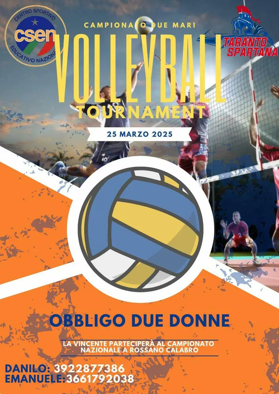 Continuano le iscrizioni per un altro grandissimo evento organizzato magnificamente da Emanuele Ciaccia e Danilo Bruno dell’ASD Taranto Spartana. Questa volta si parla di volley con il campionato Due Mari Volleyball Tournament che alzerà il sipario nelle prossime settimane. L’evento prevede l’obbligo di due donne in campo con la squadra che trionferà che parteciperà al campionato Nazionale di Rossano Calabro. Per maggiori informazioni chiamare al 3922877386 (Danilo) o al 3661792038 (Emanuele).