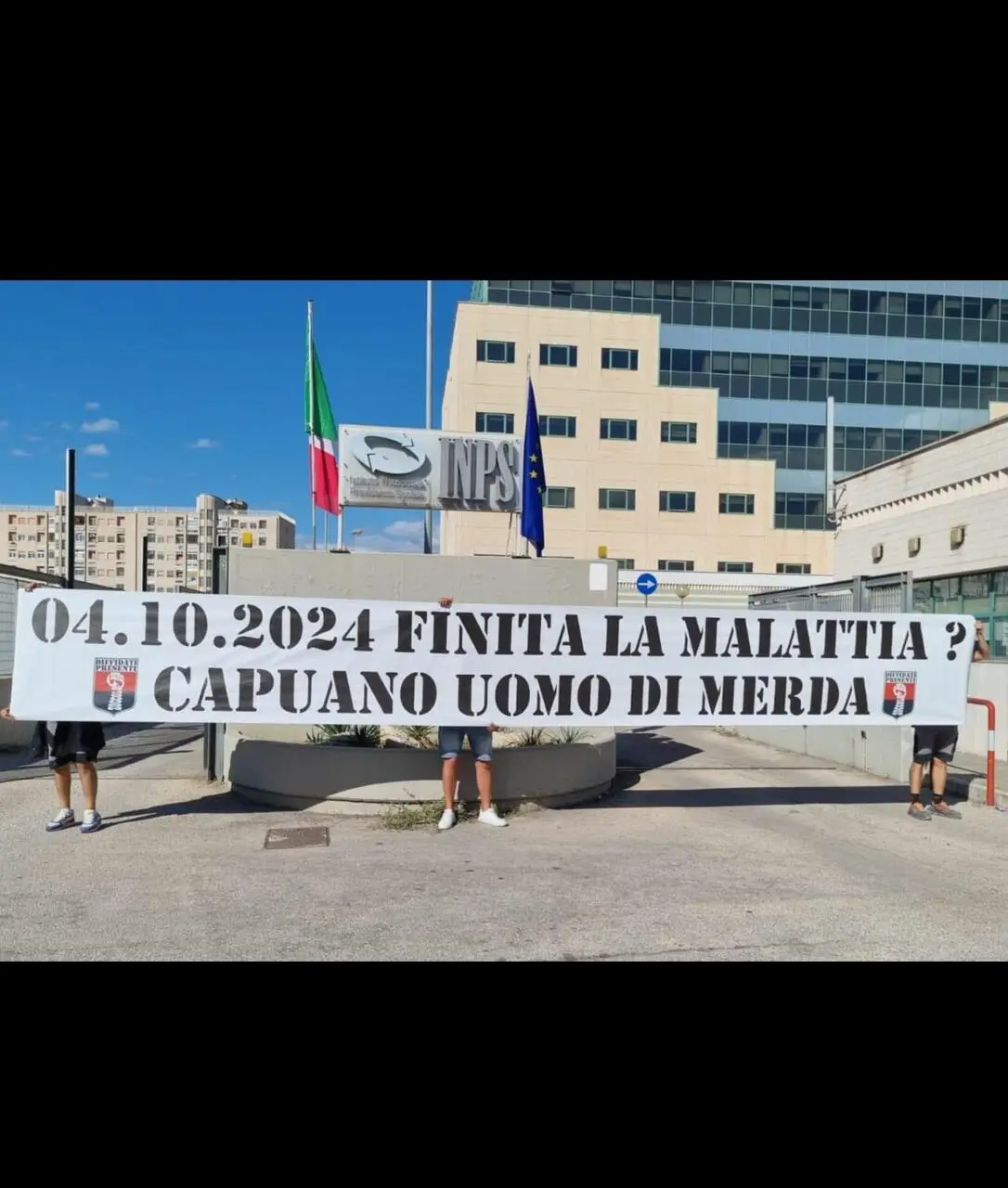 Oggi, 4 ottobre 2024, la tensione in città ha raggiunto un nuovo picco. Nel giorno del derby contro il Foggia, con l'attenzione più rivolta alla trattativa per la cessione del Taranto che alla partita stessa, proprio davanti alla sede dell'INPS, il gruppo ultras "Zoccolo Duro" ha lanciato un messaggio senza mezzi termini, esponendo uno striscione che non lascia alcuno spazio all'immaginazione: "04.10.2024 FINITA LA MALATTIA? CAPUANO UOMO DI MERDA".
