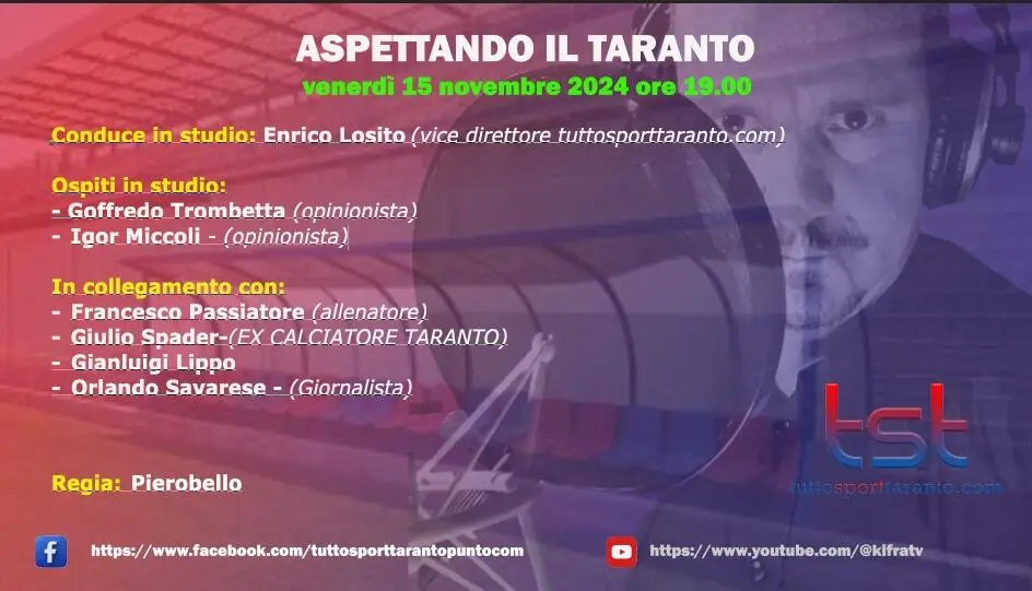 - Per visualizzare la trasmissione cliccare sul seguente link pagina Facebook di Tuttosporttaranto.com : https://www.facebook.com/events/540947532194911