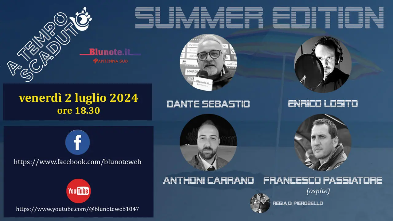 Martedì 2 luglio dalle ore 18:30, appuntamento con “A TEMPO SCADUTO”, il contenitore sportivo a cura della redazione di Blunote.it condotto da Dante Sebastio ed Enrico Losito con la partecipazione di Anthony Carrano. Il nostro ospite e opinionista sarà l’allenatore Francesco Passiatore. Commenteremo insieme le ultime novità di calciomercato relative al Taranto e alcuni stralci della conferenza stampa di ieri. Vi aspettiamo in diretta sulle pagine ufficiali Facebook e Youtube di Blunote Web dalle ore 18:30! Il contenitore sportivo è stato realizzato grazie al supporto di Hotel Virgilio in Viale Virgilio, 4 a Taranto; Ipersport in via per S. Giorgio Jonico km 10 (contrada Cimino) a Taranto; Studio Radiologico San Tommaso in via Luigi Settembrini, 232 a Talsano (TA); Studio Fornaro-Occhinegro dottori commercialisti associati, in Piazzale Dante, 8 a Taranto; in via Skanderbeg, 64 a Bari e in via Einaudi, 10 a Locorotondo (BA); Studio Dentistico Sannelli Dr. Vito e Fabio Sannelli in viale Magna Grecia, 20 a Taranto, Ottica Dierre in Corso Italia, 329/331 a Taranto; CAFFE FADI e Onoranze Funebri “GLI ANGELI s.r.l.” H24 Attolino in via Monfalcone, 17 e in via C. Battisti, 90 a Taranto e in via V. Emanuele, 31/A a Leporano.