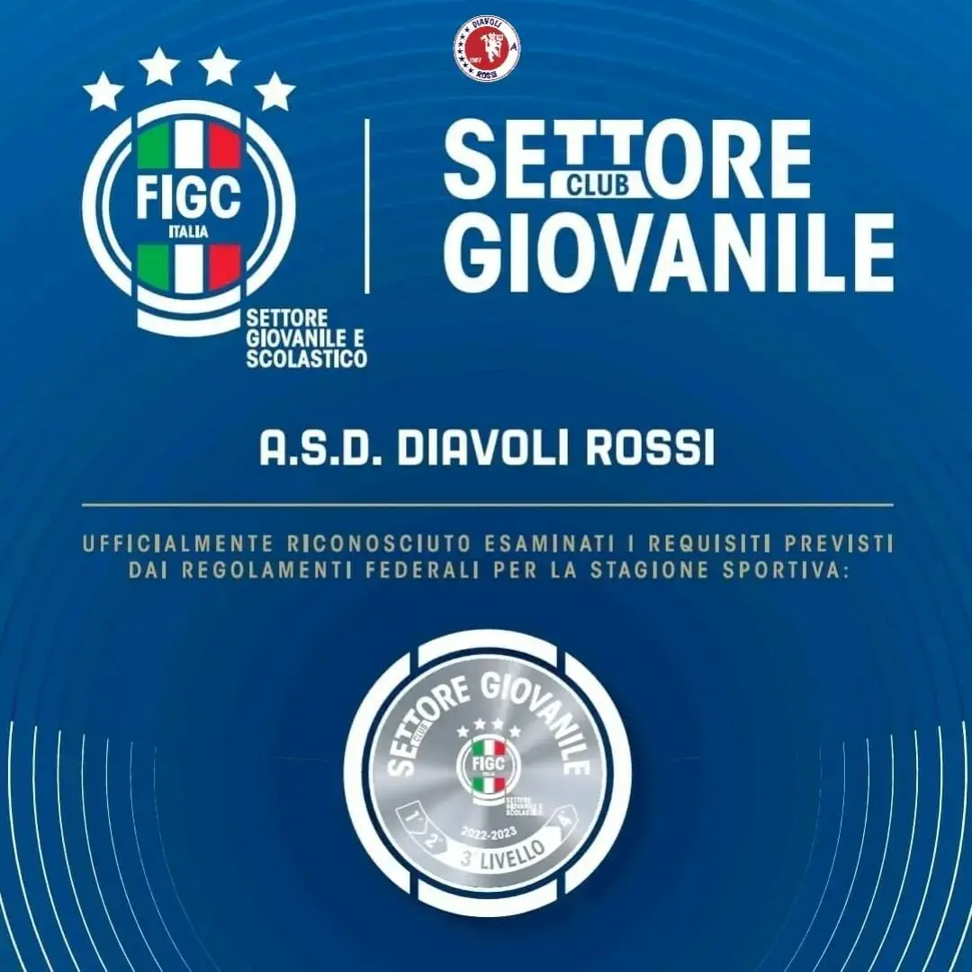 Ancora grandi notizie per la storica scuola calcio dei Diavoli Rossi che inanella soddisfazioni dal 1987. Di fatto la società dei Presidenti Renna e Fischetti ha conferito dalla FIGC il titolo di Settore Giovanile di Terzo Livello. Tutto ciò merito del grande staff tecnico e dirigenziale che tutti i giorni, da anni, lavora con passione e diligenza per far crescere i bambini e i ragazzi.