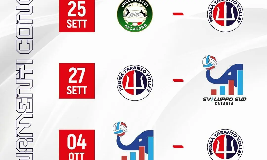 Cinque match, dunque, per mettere benzina nel motore e trovare i giusti equilibri in campo. Coach Graziosi avrà così l’opportunità di valutare attentamente ogni reparto e costruire la fisionomia della nuova Prisma Taranto Volley.