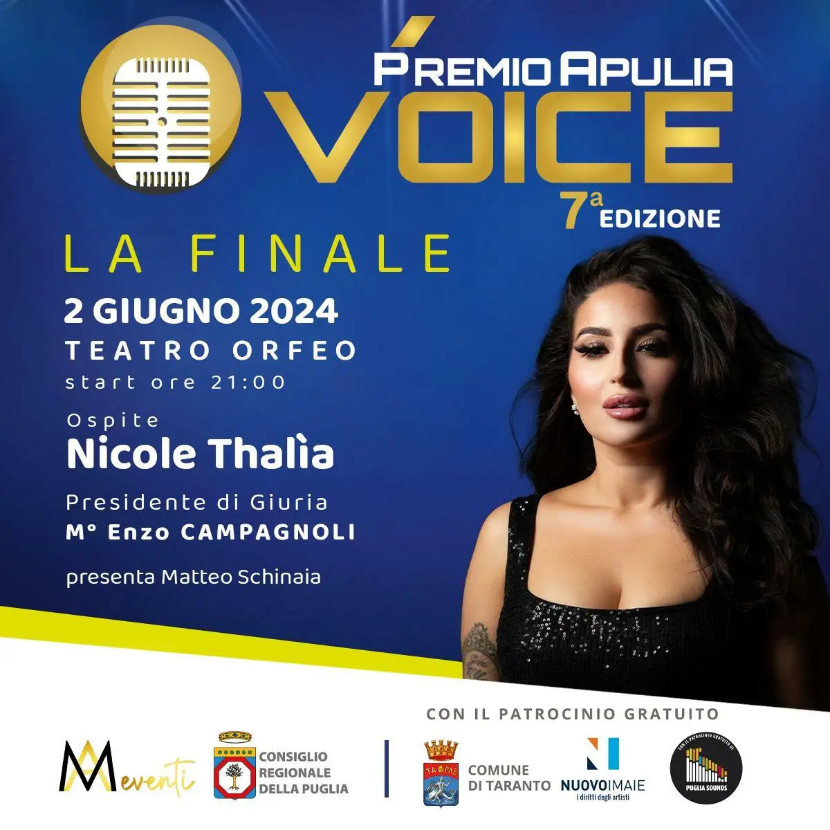 Il concorso canoro ideato e organizzato da M.A. Eventi di Mimmo ed Annarita Taurino, giunto alla settima edizione, sarà nuovamente ospitato dal Teatro Orfeo di Taranto il prossimo 2 giugno, con start alle ore 21. L'evento, supportato dal Consiglio Regionale della Puglia e con il patrocinio gratuito del Comune di Taranto, Nuovo Imaie e Puglia Sounds, sarà presentato da Matteo Schinaia, alla sua quarta conduzione.