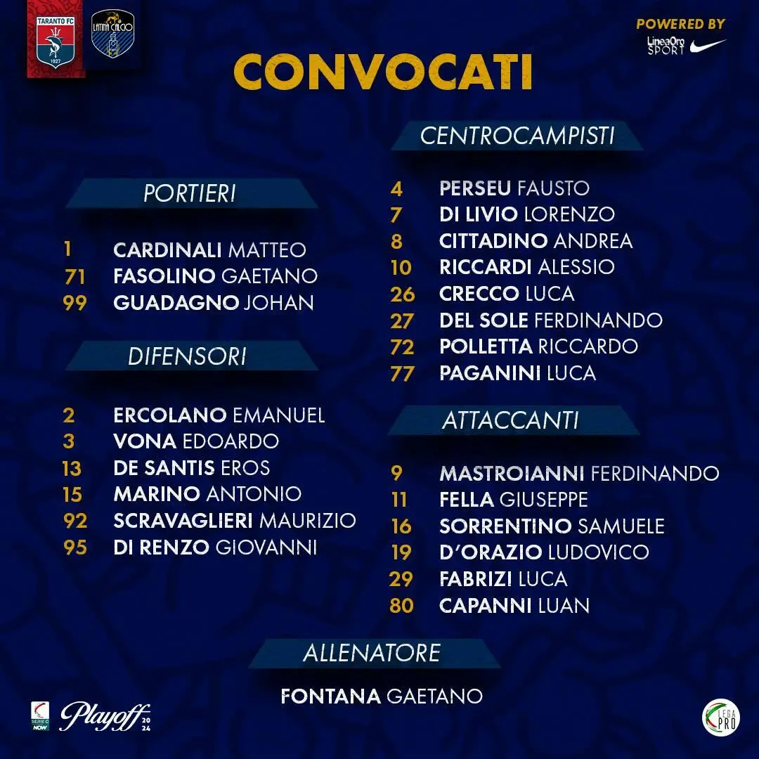Taranto: i convocati per la sfida play off con il Latina