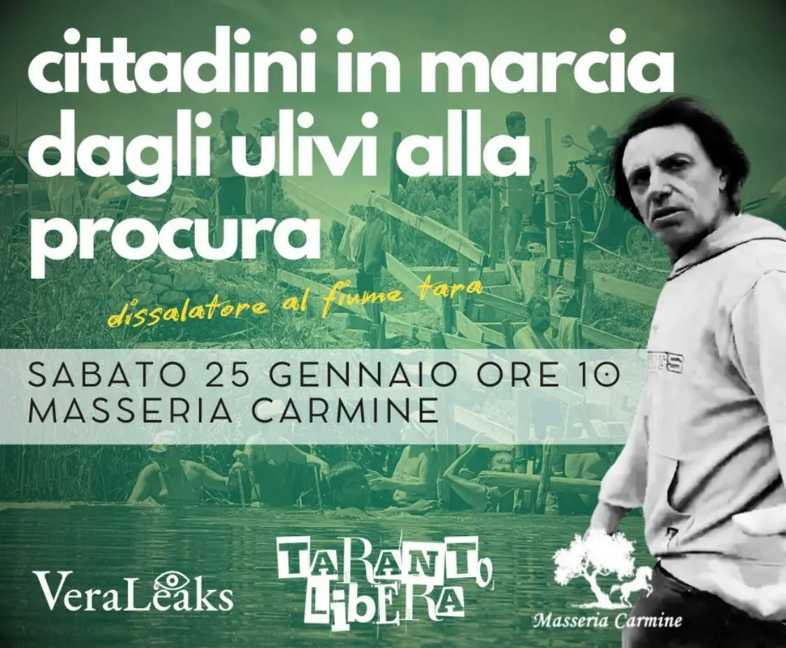 Sul progetto del dissalatore al fiume Tara si muove una nuova denuncia promossa da VeraLeaks che fa seguito a quella già depositata da Vincenzo Fornaro che, insieme a Luciano Manna e ai cittadini che raggiungeranno la Masseria Carmine ( sita a Taranto in Contrada Carmine, 6450) sabato 25 gennaio alle ore 10:00, si muoveranno a piedi verso la stazione dei Carabinieri Taranto nord di Paolo VI per depositare una nuova denuncia in virtù di alcuni nuovi elementi emersi dai documenti dell'ultima conferenza dei servizi.