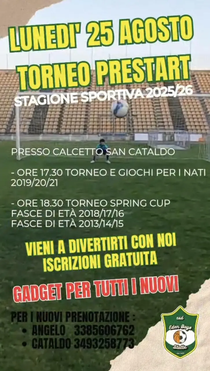In casa Eden Boys Statte è tempo di ripartire e la gloriosa società gialloverde lo fa co il botto; di fatto lunedì 25 agosto presso il Centro Sportivo “San Cataldo” di Statte i bambini potranno divertirsi con dei mini tornei (dalle 17:30 per tutti i piccoli atleti nati nel 2019, 2020 e 2021. E poi, ancora, a partire dalle 18:30 con la Spring Cup per tutti i ragazzi nati nel 2018, 2017 e 2016 oltre a quelli nati nel 2013, 2014 e 2015. Per maggiori informazioni chiamare Angelo De Florio al 3385606762.