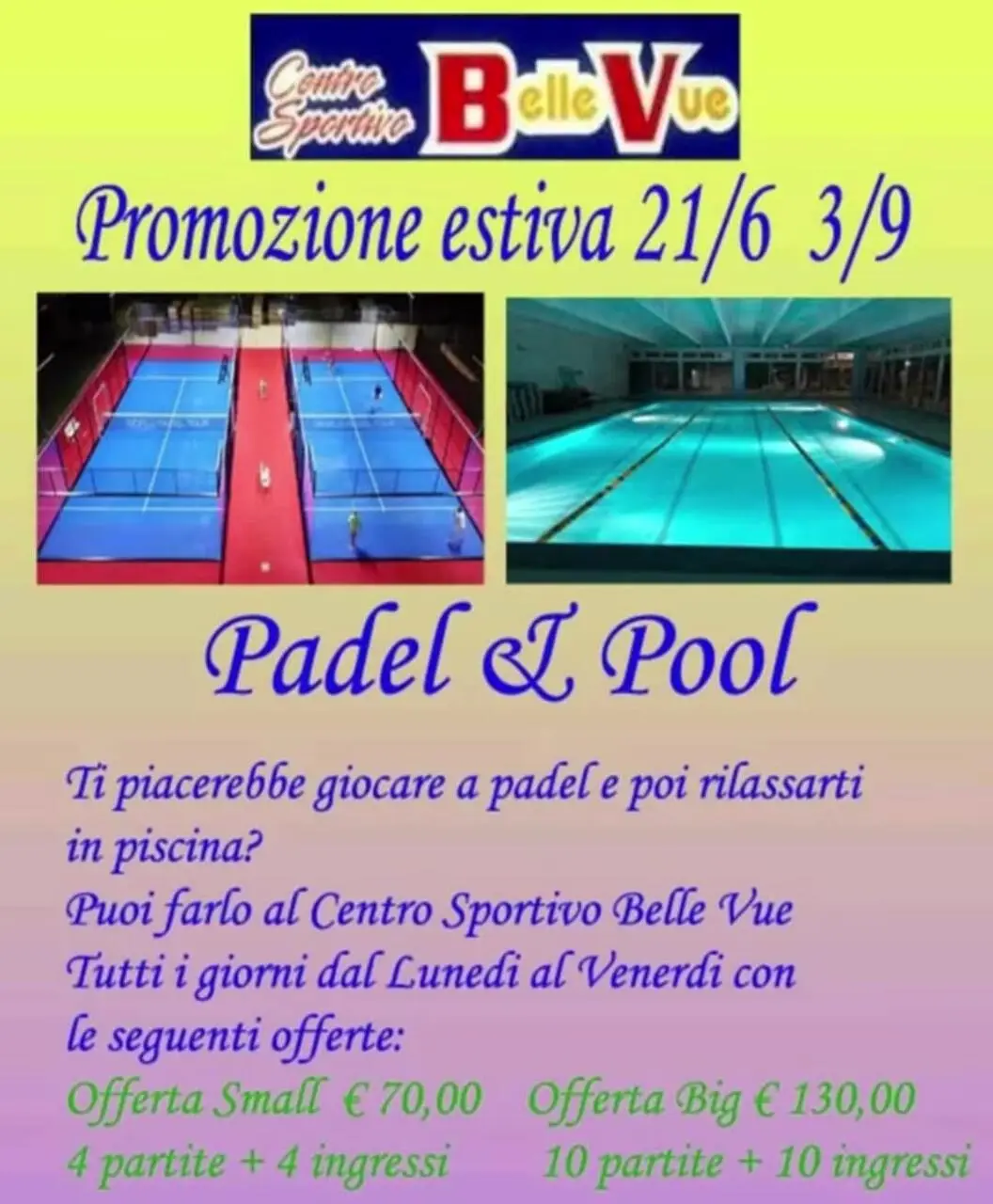 Una grande promozione estiva al Centro Sporitvo “Belle Vue” che dal 21 giugno al 3 settembre offre un abbinamento unico, divertente e rilassante. Padel e relax in piscina con due tipologie di offerta: quella small al costo di 70 euro comprendente quattro partite e quattro ingressi in piscina e quella big che include dieci match e dieci ingressi in piscina.