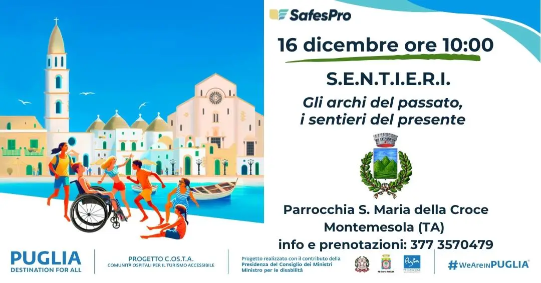 E' partito il conto alla rovescia per “Gli Archi del Passato, i Sentieri del Presente”, il secondo appuntamento del progetto S.E.N.T.I.E.R.I. (Sostenibilità, Esperienze, Natura, Territorio, Integrazione, Empowerment, Riconnessione, Innovazione) che vede come capofila la scuola di alta formazione SafesPro, che risulta vincitrice del bando C.Os.T.A. di Regione Puglia e Pugliapromozione con il contributo della presidenza del Consiglio dei Ministri - ministro per le Disabilità.