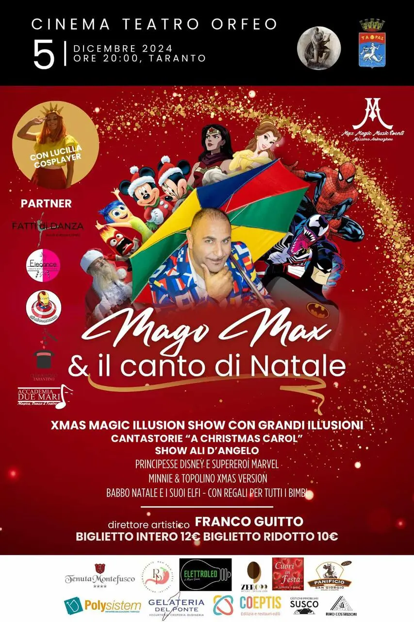 Il Natale si avvicina ed è già tempo di eventi: anche quest’anno Massimo animazione by Max Magic Music eventi ripropone, giovedì 5 dicembre dalle ore 20 al teatro Orfeo “Mago Max e il canto di Natale”. Una bellissima serata utile anche a conoscere e scattare foto con Venom, Spiderman, Batman e Wonder Woman dell’Associazione Giò Giò e i Supereroi che animeranno la serata facendo divertire grandi e piccini. Non potete mancare…