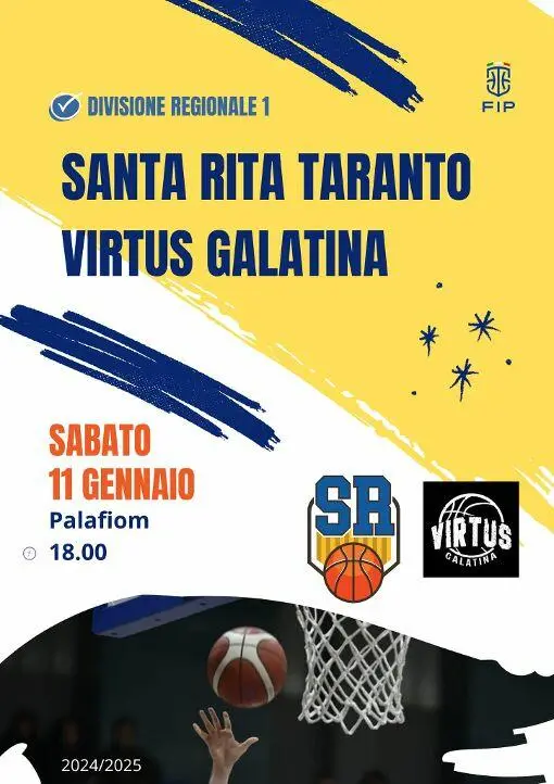 Importante appuntamento sabato prossimo, 11 gennaio 2025, al Palafiom di Taranto (ore 18) per la tredicesima giornata del campionato di #DivisioneRegionale1 di pallacanestro. Santa Rita Basket Taranto ospita infatti la Virtus Galatina, uno dei roster più forti del girone B (84-83 per i salentini, nella gara d'andata).