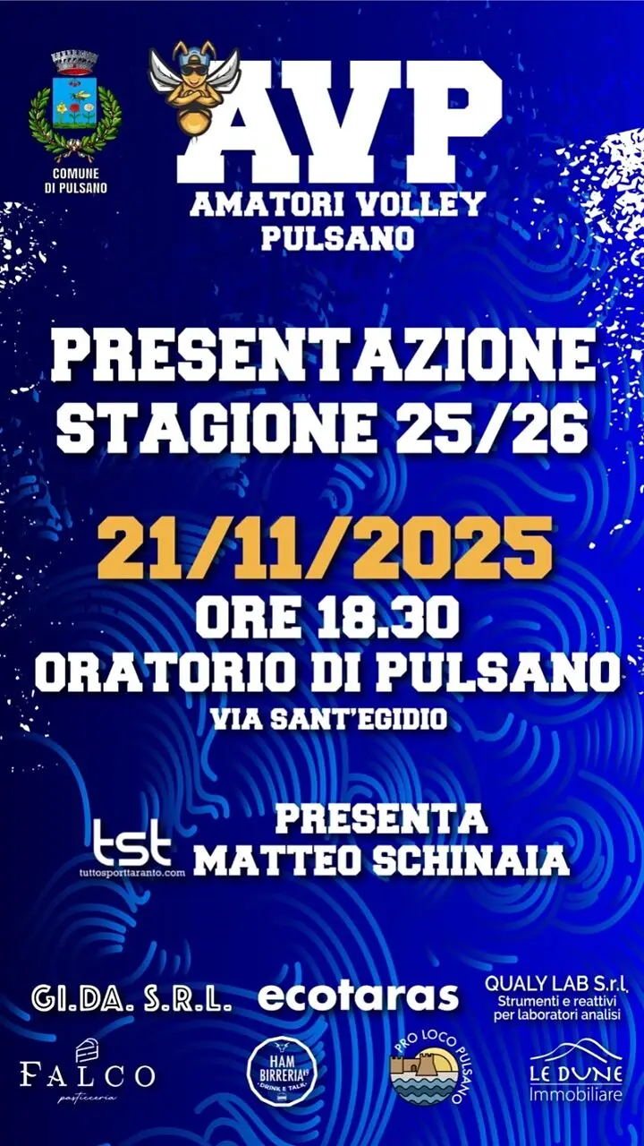 La stagione 25/26 dell’Amatori Volley Pulsano è già entrata nel vivo, tra allenamenti, prime uscite ufficiali e un entusiasmo che continua a crescere attorno alla squadra. Il momento istituzionale che ne segna la presentazione ufficiale è fissato per venerdì 21 novembre 2025, alle 18.30, all’interno dell’Oratorio di Pulsano in via Sant’Egidio, con il patrocinio del Comune di Pulsano.
