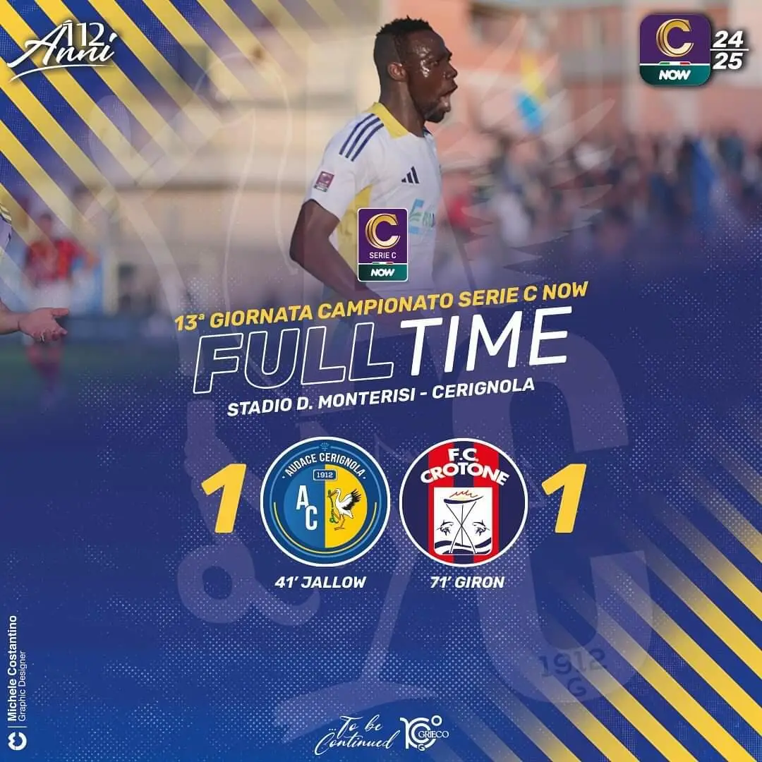 AUDACE CERIGNOLA: Saracco; Visentin, Gonnelli (36’st Martinelli), Ligi; Russo, Tascone (32’st Bianchini), Capomaggio, Paolucci (32’st Sainz-Maza), Tentardini; Jallow (18’st Ruggiero), Salvemini (36’st Faggioli). A disp.: Greco, Fares, Gagliano, Parigini, Velasquez, Carnevale, Romano, lurilli, Carrozza, Di Dio.