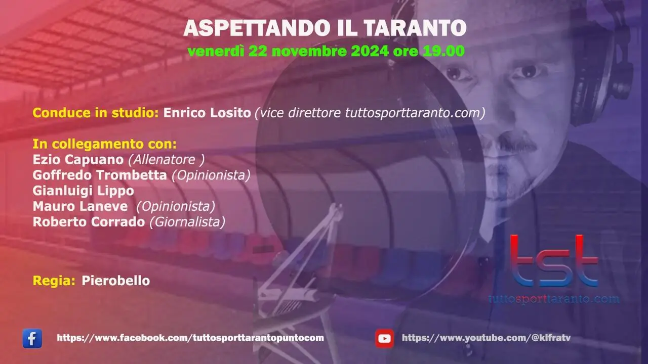 Venerdì 22 novembre dalle ore 19:00, appuntamento con “ASPETTANDO IL TARANTO”, il contenitore sportivo a cura della redazione di Tutto Sport Taranto.com condotto da Enrico Losito con la regia di Piero Bello. Nel corso della puntata tratteremo le tematiche di stretta attualità del Taranto Fc 1927 in particolare della cessione societaria e della sconfitta contro la Cavese proiettandoci anche verso la gara Taranto-Benevento. In diretta dagli studi della nostra redazione di Ki.Fra Tv avremo in collegamento esterno ci saranno: l’allenatore Ezio Capuano; i nostri Goffredo Trombetta e Gianluigi Lippo; Mauro Laneve in qualità di opinionista e da Benevento Roberto Corrado, giornalista di Cronache del Sannio. Vi aspettiamo in diretta sulle pagine ufficiali Facebook e Youtube di Tutto Sport Taranto e Ki.fra tv dalle ore 19:00 con le vostre domande, commenti e opinioni…NON MANCATE!!! Il contenitore sportivo è stato realizzato grazie al supporto di Ipersport in via per S. Giorgio Jonico km 10 (contrada Cimino) a Taranto; Studio Radiologico San Tommaso in via Luigi Settembrini, 232 a Talsano (TA); Studio Fornaro-Occhinegro dottori commercialisti associati, in Piazzale Dante, 8 a Taranto; in via Skanderbeg, 64 a Bari e in via Einaudi, 10 a Locorotondo (BA); Ottica Dierre in Corso Italia, 329/331 a Taranto; Birroteca Puglia in via Cataldo Nitti, 14 a Taranto; Erario Ottavio Srls – Costruzioni edilizie in via Don Minzoni, 2 a Manduria (TA), Guernica - cucina pizzeria tarantina in via Acclavio, 4-10 a Taranto, Peperoncino Rosso Trattoria, via S. Francesco 13/b a Statte (TA).