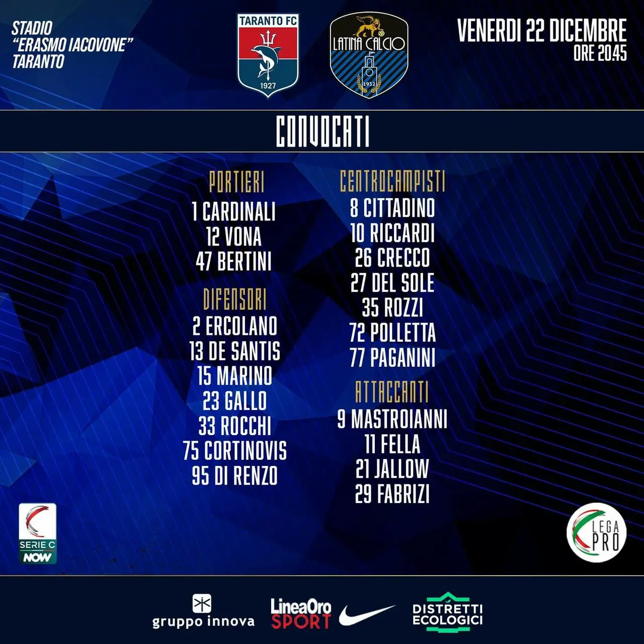 Taranto: convocati, due gli indisponibili per la gara con il Latina