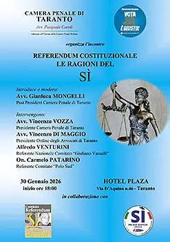 Nell’ambito di una serie di eventi pubblici organizzati dalla Camera Penale di Taranto nel territorio jonico, venerdì 30 gennaio alle ore 18,00 presso l’Hotel Plaza a Taranto si terrà l’incontro, in collaborazione con ilComitato Vassalli ed il Comitato Polo Sud, “Referendum costituzionale. Le ragioni del Sì”.