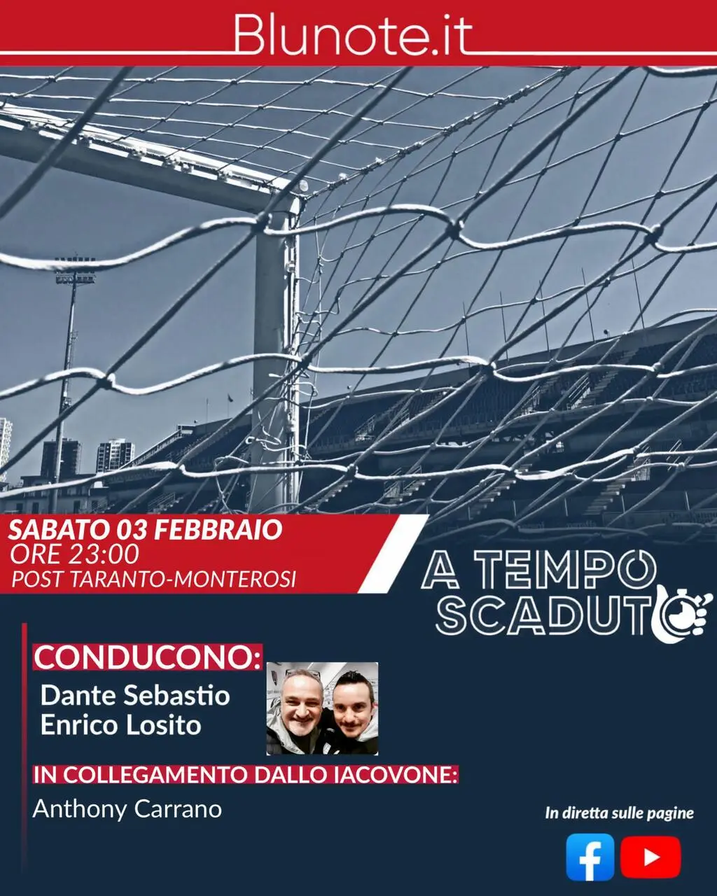 Sabato 3 febbraio dalle ore 23:00, appuntamento con “A TEMPO SCADUTO”, il contenitore sportivo a cura della redazione di Blunote.it condotto da Dante Sebastio ed Enrico Losito. Commenteremo la gara Taranto-Monterosi con il nostro Anthony Carrano che raccoglierà nel post gara le dichiarazioni dei protagonisti dalla sala stampa dello stadio Erasmo Iacovone di Taranto. Vi aspettiamo in diretta sulle pagine ufficiali Facebook e Youtube di Blunote Web dalle ore 23:00! Il contenitore sportivo è stato realizzato grazie al supporto di Hotel Virgilio in Viale Virgilio, 4 a Taranto; Ipersport in via per S. Giorgio Jonico km 10 (contrada Cimino) a Taranto; Elettrica Martino in Via De Cesare, 8/10 a Taranto; Studio Radiologico San Tommaso in via Luigi Settembrini, 232 a Talsano (TA); Teatro Cinema Orfeo in via Pitagora, 98 a Taranto; Studio Fornaro-Occhinegro dottori commercialisti associati, in Piazzale Dante, 8 a Taranto; in via Skanderbeg, 64 a Bari e in via Einaudi, 10 a Locorotondo (BA); Studio Dentistico Sannelli Dr. Vito e Fabio Sannelli in viale Magna Grecia, 20 a Taranto, Ottica Dierre in Corso Italia, 329/331 a Taranto; Farmacia Galantino di Mauro e Carla in via Medaglie D’Oro, 19 a Taranto; CAFFE FADI, Coffee World by Coffee Break in via Dante Alighieri, 283 a Taranto e Onoranze Funebri “GLI ANGELI s.r.l.” H24 Attolino in via Monfalcone, 17 e in via C. Battisti, 90 a Taranto e in via V. Emanuele, 31/A a Leporano.