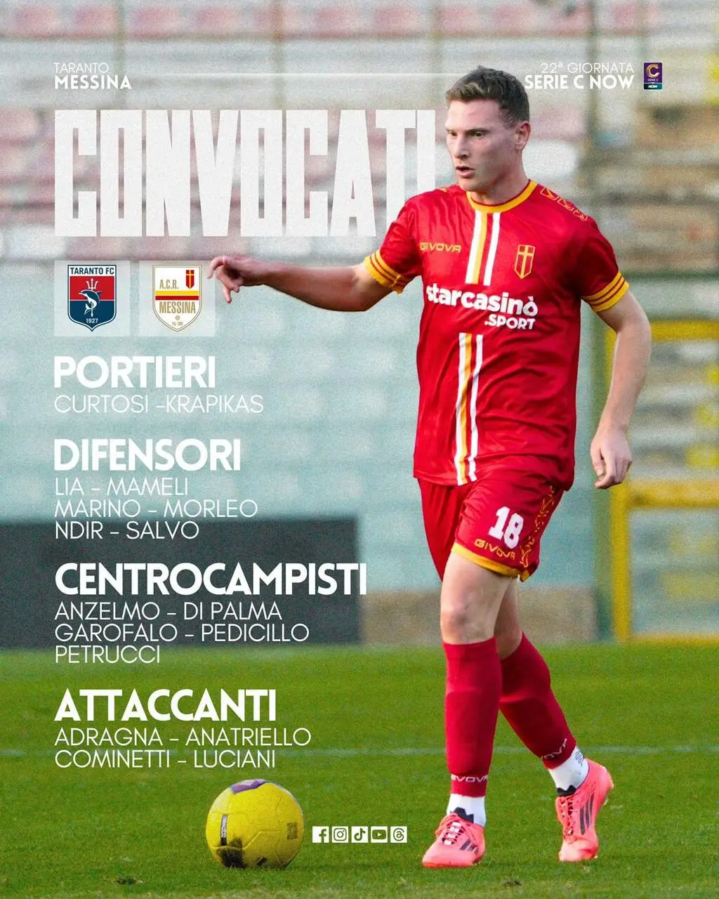 Taranto F.c. News FOTONOTIZIA ACR Messina: i convocati per la sfida con il Taranto 10.01.2025 20:01 0 Twitter Facebook Whatsapp Telegram Email I convocati del tecnico Modica in vista della sfida con il Taranto: