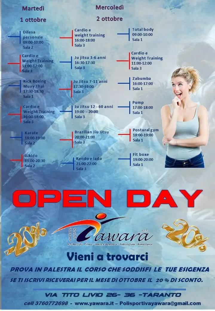 Come accade da anni, presso la Palestra Yawara – Scuola Cassano sempre grandi corsi e tante nuove idee per tutti gli sportivi sia nel campo del fitness che delle arti marziali. Maestri e Istruttori qualificati, l’1 e il 2 ottobre presso la struttura sita in Via Tito Livio 26/36 terrà degli Open Day gratuiti per far conoscere e provare “nuove” discipline. Per maggiori informazioni sui corsi e sulle iscrizioni chiamare i numeri 0994519394 o 3760772698. Non mancare vienici a trovare!
