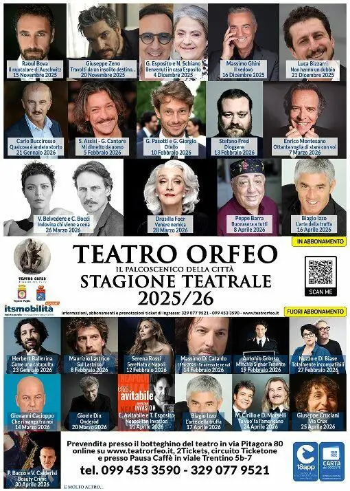 La stagione, che prenderà il via il 15 novembre 2025, è organizzata con il patrocinio del Comune di Taranto. Alla conferenza stampa di presentazione hanno preso parte il Sindaco di Taranto Piero Bitetti, Adriano Di Giorgio e Luciano Di Giorgio del Teatro Orfeo e il regista Clarizio Di Ciaula.